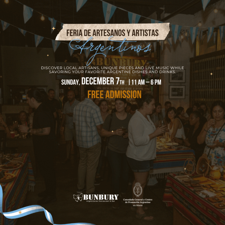 Discover Argentine art, live music, and authentic flavors. • Sandwich & choripán station outdoors at Happy Hour prices • Live music • Bunbury open with its brunch menu and Argentine drink Happy Hour • Indoor and outdoor exhibit areas (bar and dining room spaces) 🎟 Free admission